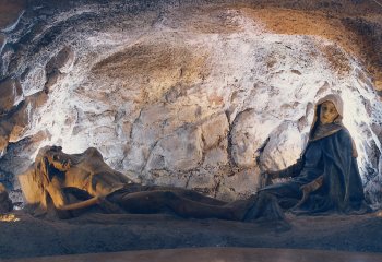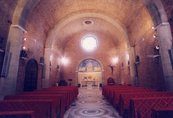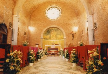 La cripta dell�antico SantuarioNel 1947, Don Umberto Terenzi, primo parroco del Santuario, trasform� la cisterna del castello medievale in una splendida chiesa, con il mosaico del Buon Pastore nell�abside, e il sepolcro di Ges� con la Vergine Addolorata (opera dello scultore Umberto Mastroianni).