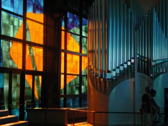 Nello spazio dedicato alla penitenzieria la macchia violacea di una vetrata ci fa pensare al male del peccato e crea un’atmosfera di contrita riflessione, confortata però dal bagliore di colori più accesi, simbolo del calore affettuoso della misericordia di Dio per tutti i figli prodighi.