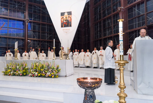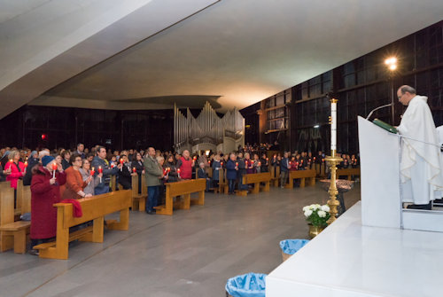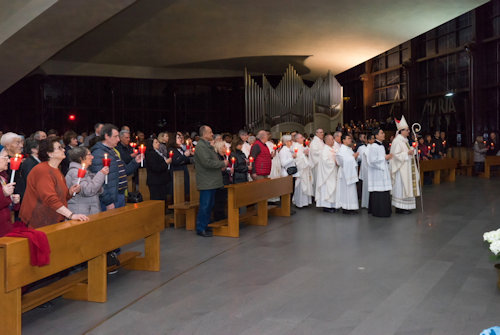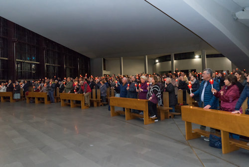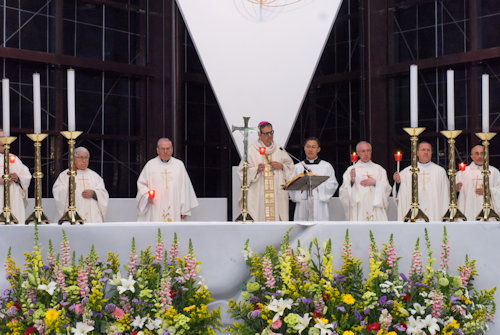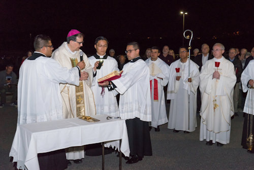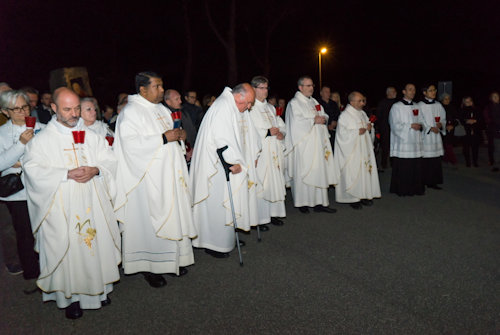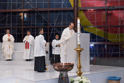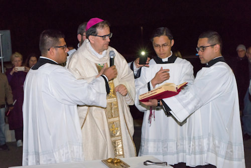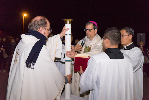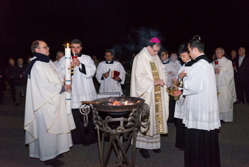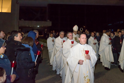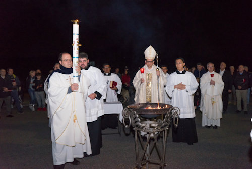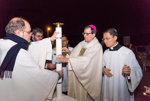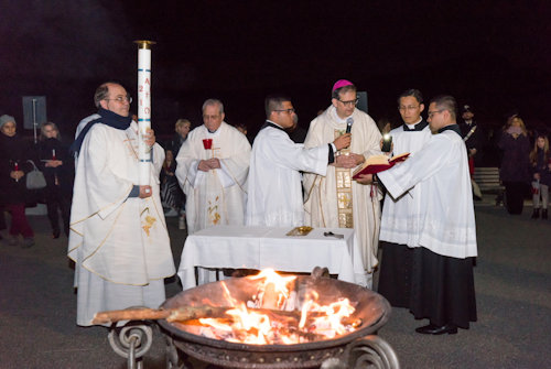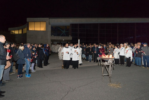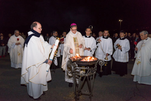 Con l'accensione del fuoco nuovo all'esterno del Nuovo Santuario, Monsignor Paolo Lojudice, Vescovo Ausiliare di Roma sud, dà inizio alla Solenne Veglia Pasquale